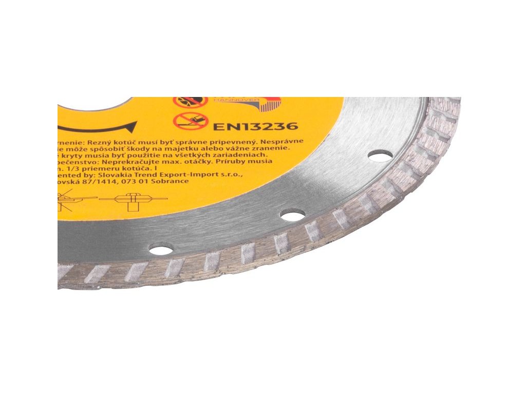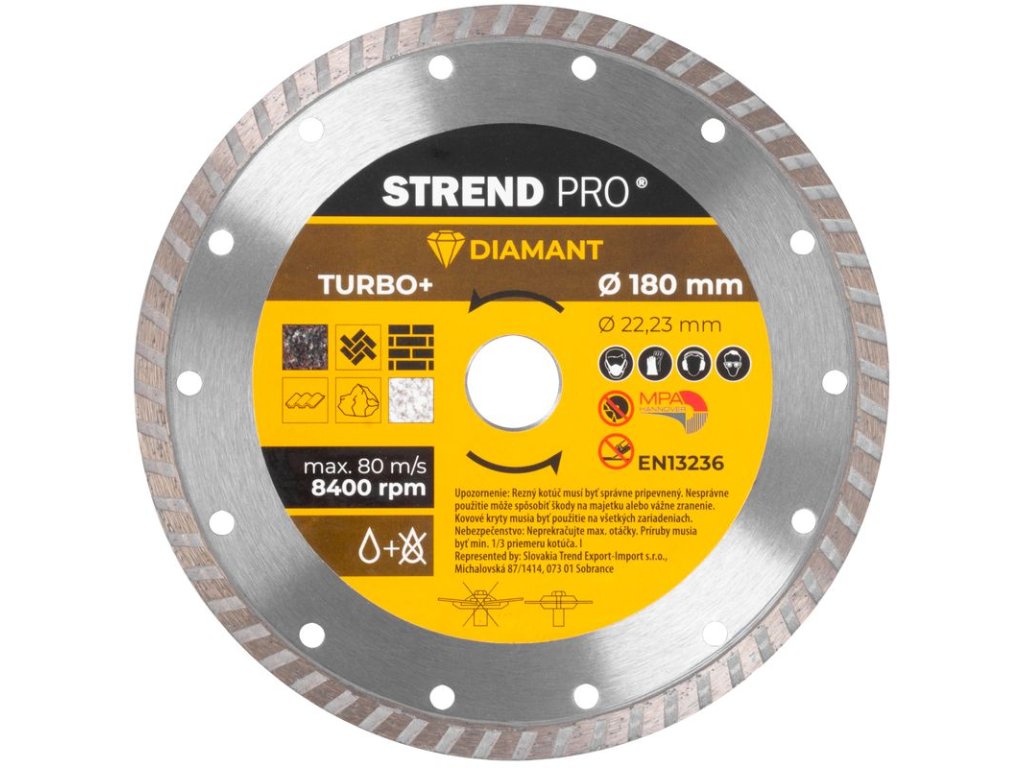 Diamantový kotúč Strend Pro je určený pre domácich kutilov, ale aj pre profesionálnych remeselníkov. Je vhodný na mokré aj suché rezanie. Konštrukcia TURBO+ lemu zachytáva vzduch v pohybe, čím sa zabezpečuje lepšie odvádzanie materiálu čo zaručuje čistejšie rezné hrany bez odlamovania materiálu, rýchlejšie rezy, optimálnu životnosť a zároveň dochádza k redukcii zahrievania. Chladiace otvory pomáhajú zvýšiť viditeľnosť pri rezaní odvádzaním materiálu a zaisťujú rozptyl tepla. Má široké využitie - žula, dlažba, obklad a je možné jeho použitie na mramor, tehly, kameň, murivo a strešnú krytinu. Jeho priemer je 180 mm a maximálne povolené otáčky sú 8 400 rpm.