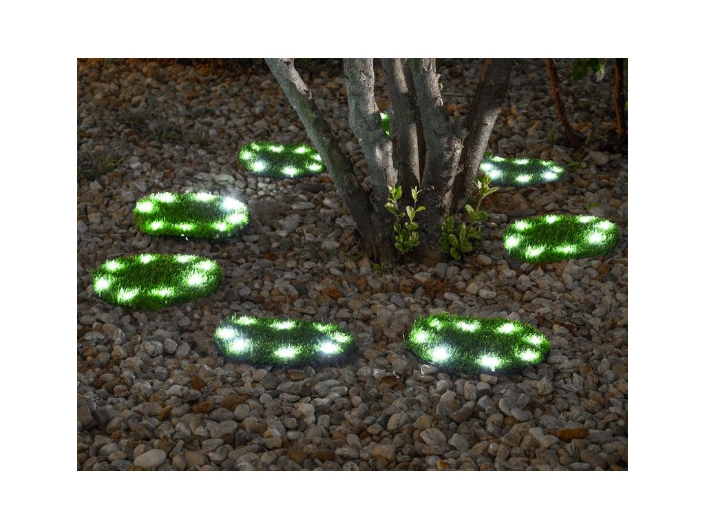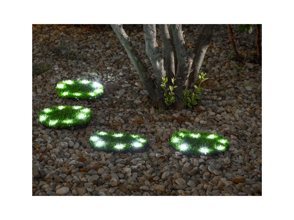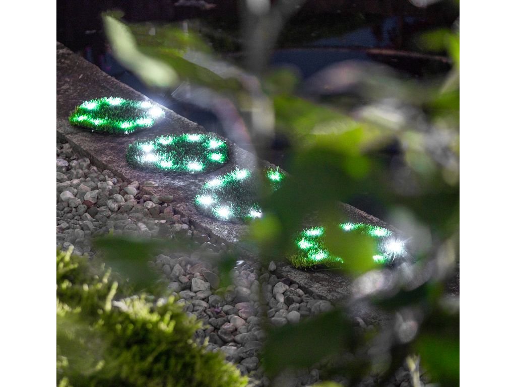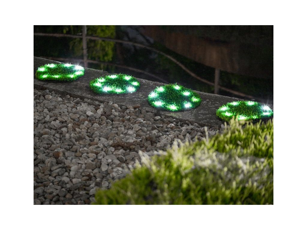 Trávnaté solárne platne s 8 LED sú moderným doplnkom každej záhrady, môžete ich položiť napr. do kvetinového záhonu a spríjemniť si večerné posedenie na terase či dvore. Počas dňa solárny panel konvertuje slnečnú energiu na elektrickú energiu, ktorá sa ukladá do dobíjateľnej batérie. V noci sa svetlo automatický zapne a využíva uloženú energiu. Platne tak prostredníctvom 8 LED diód svietia príjemným svetlom. Platne majú priemer 24 cm. Balenie obsahuje 4 ks.